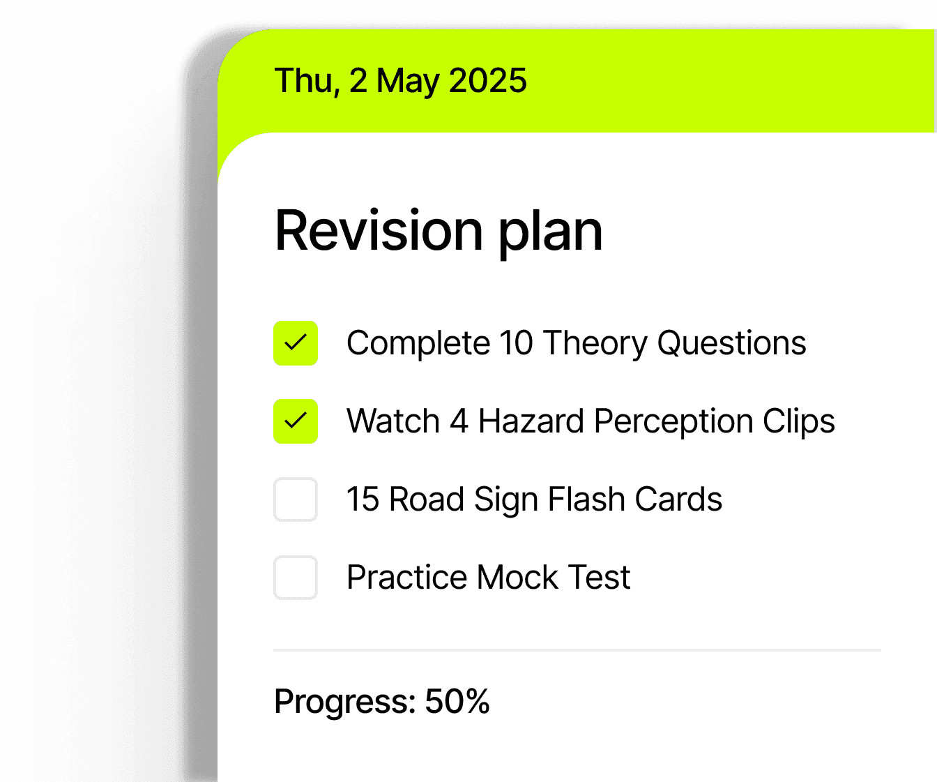 Share your study plan with friends or your driving instructor. Nobody wants to be the last to pass their test.